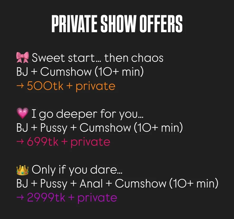 Ahegao, Camel Toe, Deepthroat, Shower, Flashing, Yoga, Cosplay, Flexing, Kissing, Cock Rating, Sex Toys, Twerk, Anal, Facial, Pussy Licking, Massage, Masturbation, Fingering, Blowjob, 69 Position, Cowgirl, Doggy Style, Role Play, Striptease, Topless, Spanking, Erotic Dance